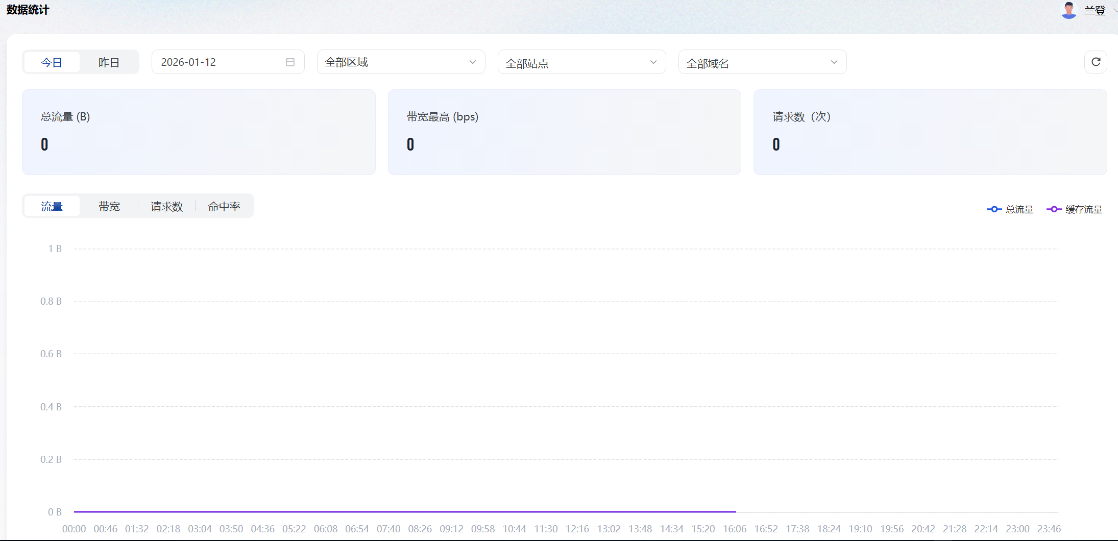 这里可以看见站点的实时数据,总的流量是多少、最高的带宽是多少、请求数是多少以及命中率是多少。
