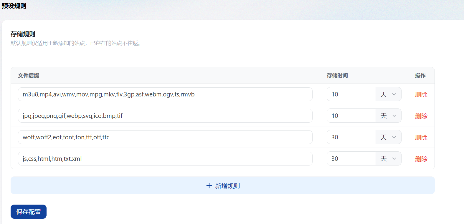 缓存规则用于为新添加的站点设定默认的缓存策略。系统会根据文件类型自动匹配对应的缓存时间,以提升静态资源的命中率和访问性能。