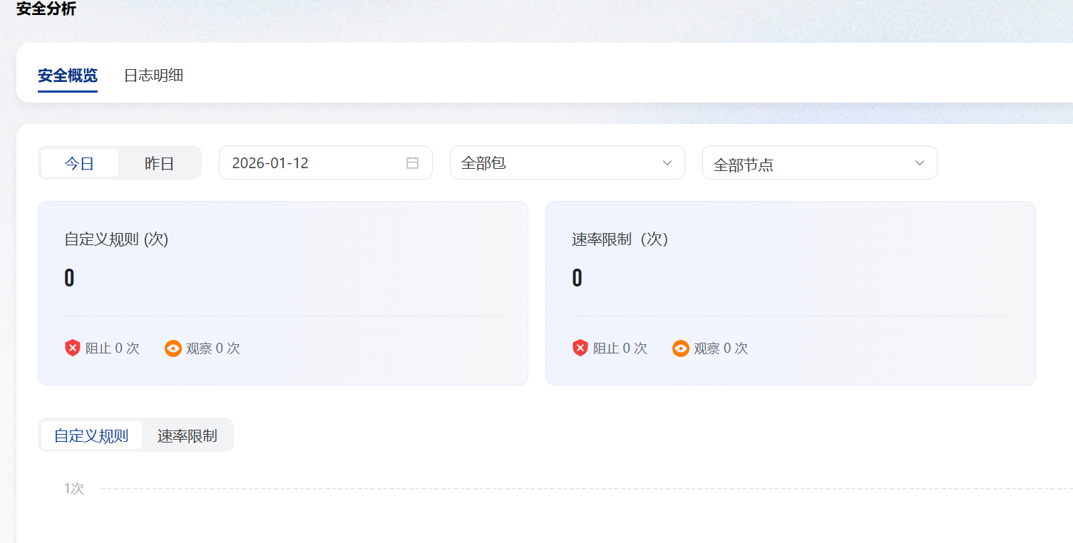 节点安全分析用于展示节点在特定时间内的安全拦截情况,包括白名单、自定义规则、速率限制等安全数据。通过 “安全概览” 与 “日志明细” 两个模块,帮助你快速定位攻击来源、分析恶意请求、排查误拦截等问题。