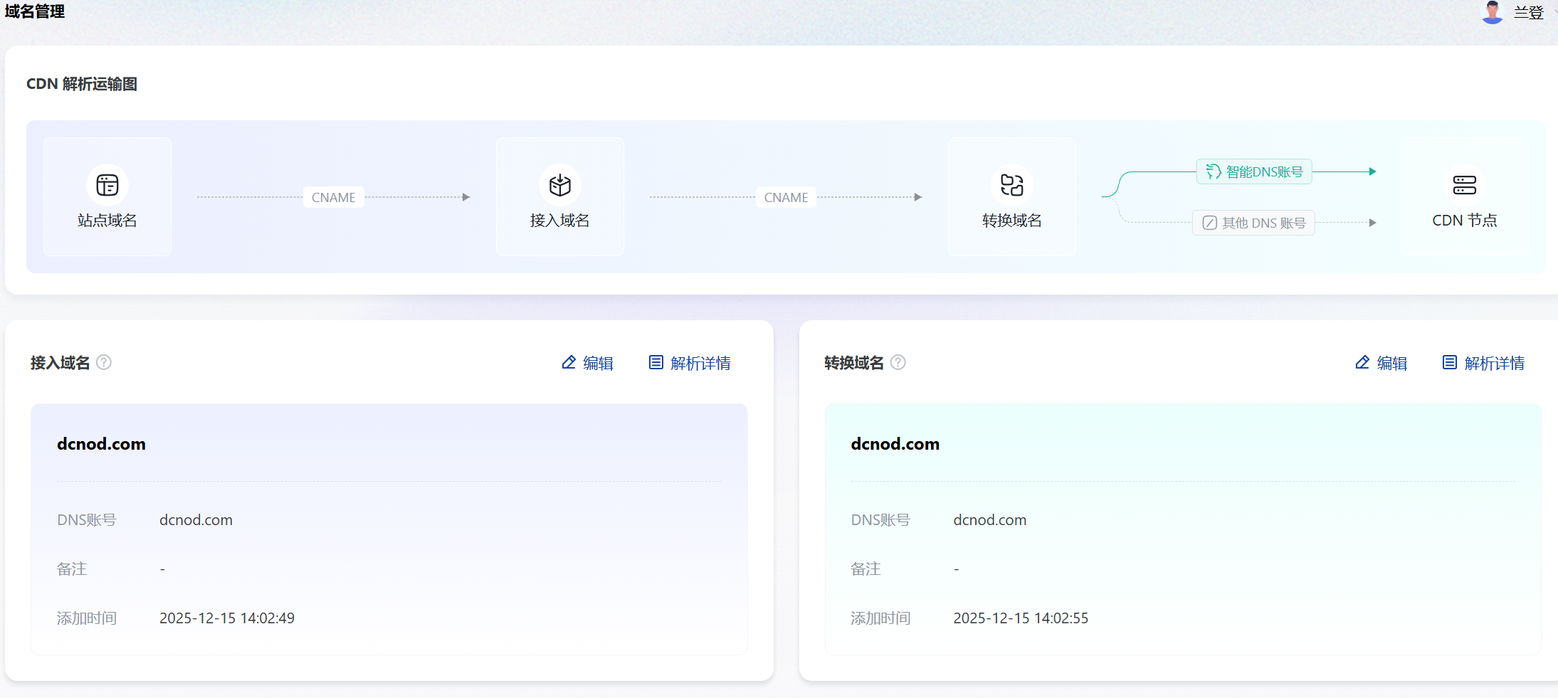这里配置就是域名配置,本模块负责接入域名与转换域名的统一调度。通过业界领先的双层 CNAME”机制,系统实现了流量在业务层与物理层之间的深度解耦。这种架构不仅增强了流量调度的灵活性,更确保了在节点切换或策略调整时,业务侧能够感知无遗、平滑过渡。