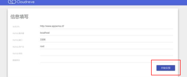 此时,返回宝塔面板,找到刚才创建的网站的数据库名、用户名和密码。将这些信息填写到 Cloudreve 的配置界面中,然后点击“开始安装”。